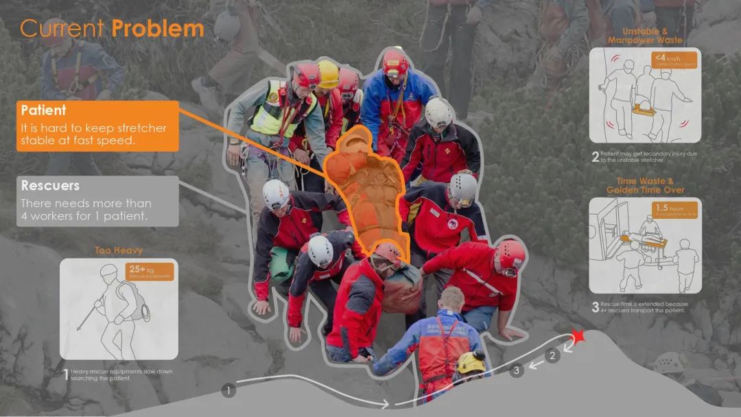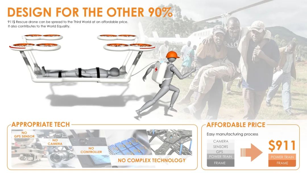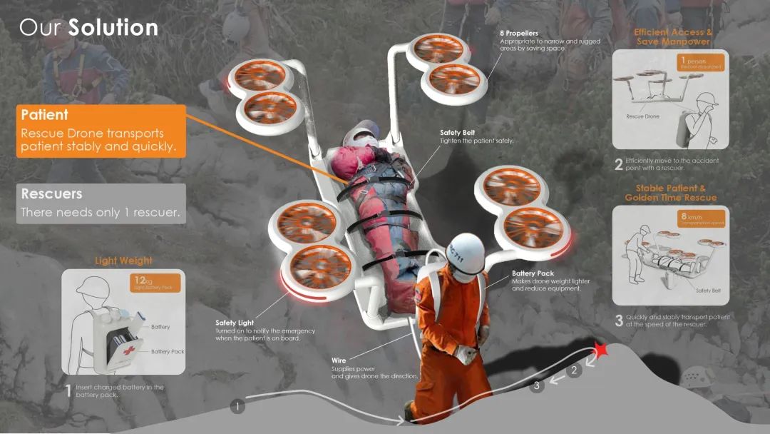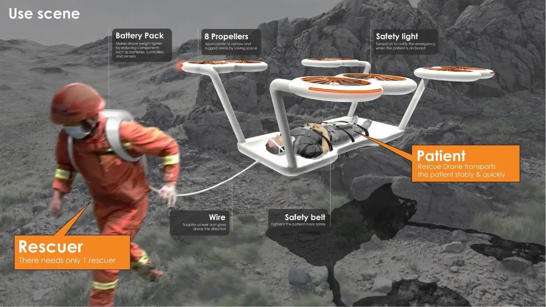 911 $救援无人机与现有担架相比,使用更少的人力即可高效,迅速地运送患者。紧凑的“ 8螺旋桨”使无人机更小。它可以帮助无人机在狭窄,森林或崎areas不平的地方进行救援。另外,由于电线可以指示无人机方向,因此救援人员无需单独控制无人机。它可以帮助救援人员保持黄金时间。