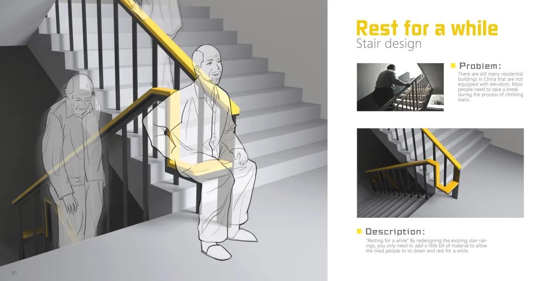 中国仍然有许多没有电梯的住宅建筑。大多数人在爬楼梯的过程中需要休息一下。 “休息片刻”通过重新设计现有的楼梯栏杆,您只需要添加一点材料即可使疲倦的人坐下来休息一会儿。