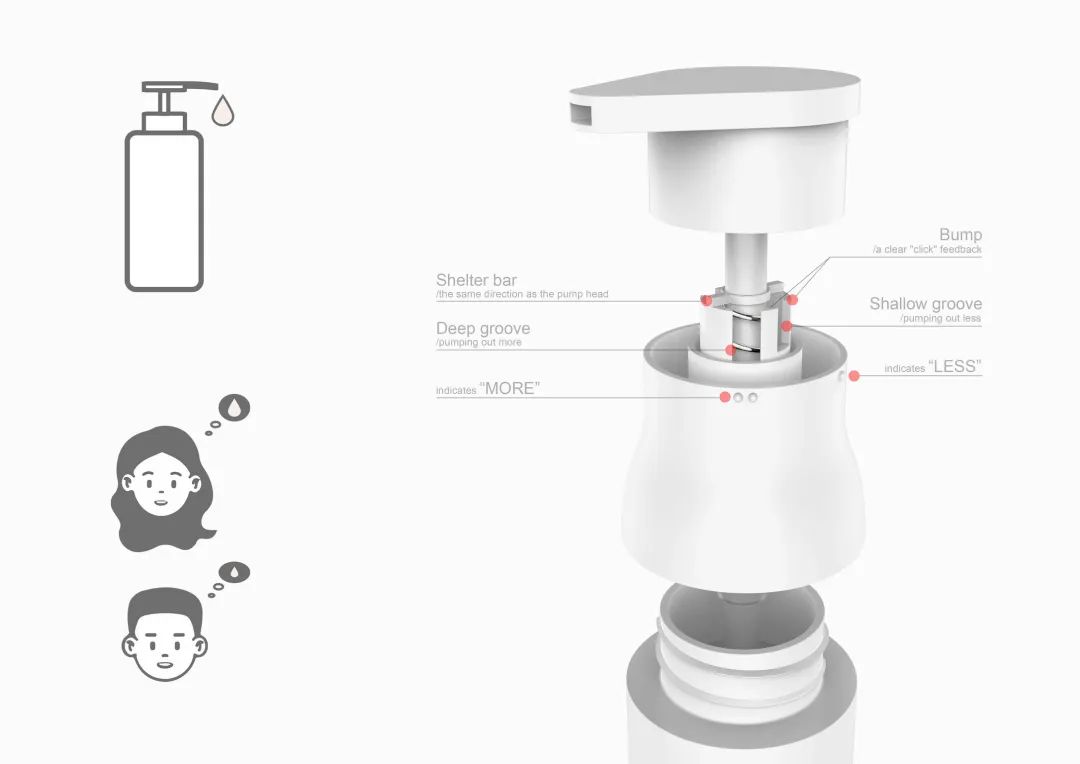 每个人对个人护理产品(如洗发水)的需求各不相同。但是,除非经过仔细的手动控制,否则泵头瓶一次只能泵出一定量。经常会抽出过多的液体,这带来了不便和浪费。基于这个问题,我们设计了一种新型的护理产品泵头,旨在通过简单的结构调整来控制不同档位的输出量。因此,用户可以选择所需的不同容积,一个泵头可以满足整个家庭的需求。我们希望一小瓶啤酒能表现出最大的诚意。
