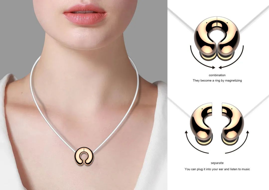 将珠宝融入耳机的设计中, 分离时,您可以将其放在耳边听音乐。结合在一起时,它又是一条项链。 采用珠宝加工标准,使耳机的外观看起来非常有质感和高端感。磁铁的位置为CNC切割。激光字母易于区分左耳和右耳,使产品更加精致。