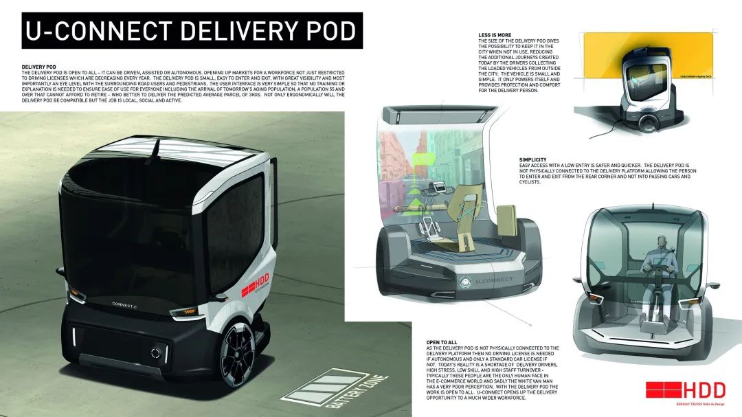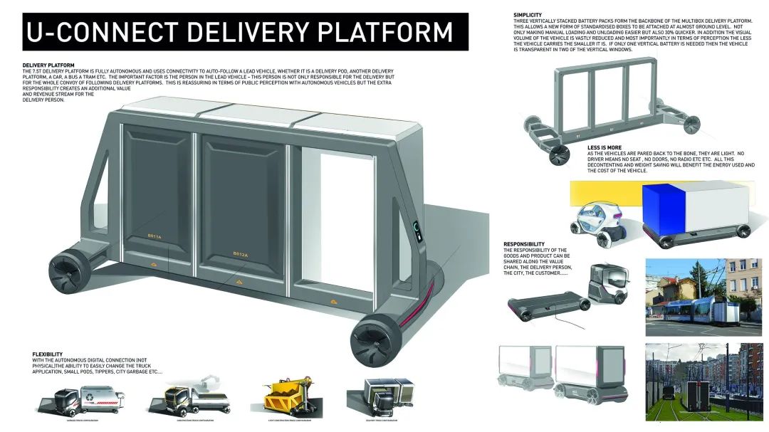 结合自动驾驶技术,电动汽车和连通性,U-connect可以以相同的成本运输多达6.5倍的货物,同时优化进出城市的流量-有效地减少了LCV造成的城市拥堵多达50% 。自主的7.5吨模块可能会绕过当前的许可证法律,而责任由铅舱或车辆中的人员承担,这增加了最后一英里交付的人为因素。在街道上可轻松访问标准化集装箱,从而将效率提高了30%,并减小了车辆的整体尺寸,以实现更好的感知。