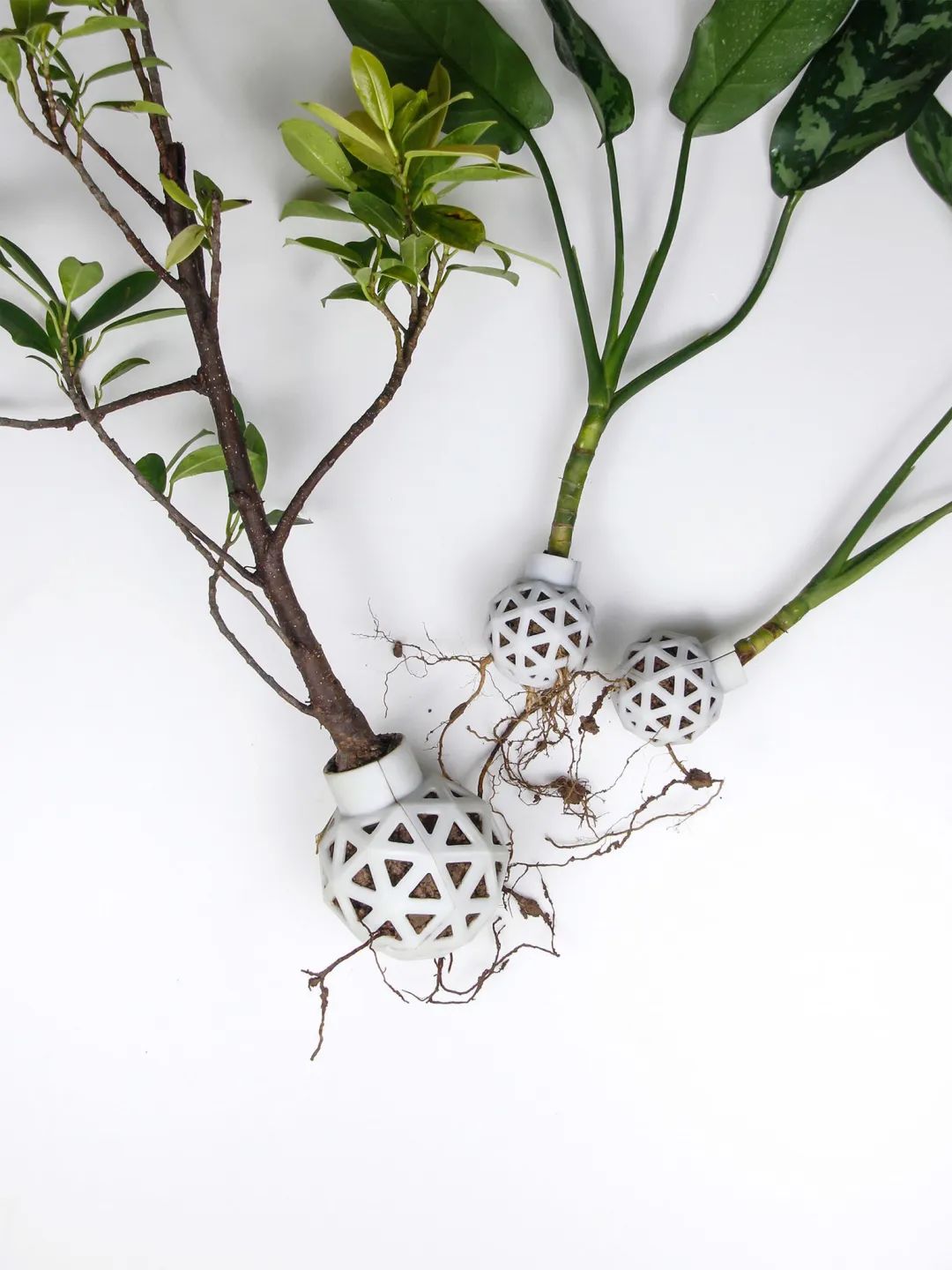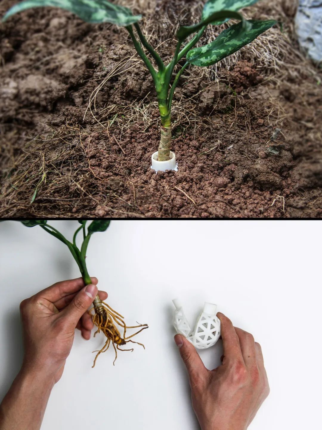 此设计针对需要移植出售的花朵。在移栽过程中,花的根和茎很容易受到外力的破坏,从而降低了植物的产量并给农民造成经济损失。这是一种由聚乳酸塑料制成的保护装置,可作用于幼苗的根部,保护花朵的主根免受农具和啮齿动物的伤害,其突出的颈部设计为避免拉动时直接与植物的茎直接接触出来。