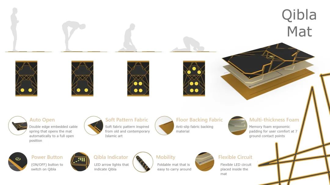 朝拜是Ka'bah(麦加的圣地)的方向,穆斯林每天祈祷五次时要面对自己。在不熟悉的地方,找到朝拜可能是一件麻烦的事情。Qibla Mat是将传统祈祷垫与当今的陀螺仪和电子技术融合在一起的一种概念,旨在获得最佳的用户体验,以找到Qibla并进行舒适的祈祷。通过厚厚的泡沫填充物覆盖地面接触点,提高祈祷舒适度,泡沫填充物覆盖着柔软的,亲肤性的织物,并装饰有当代伊斯兰艺术图案。Qibla指示器LED箭头点亮,指示Qibla旋转方向,直到成功。