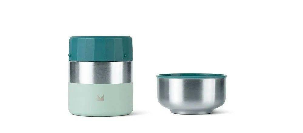 这款真空卫生的婴儿食品保温容器由卫生型不锈钢制成,以女性化,简约的设计语言呈现。它的盖子灵感来自经典的饭碗。由于其热敏表面,该碗的颜色从绿色变为白色,以警告您进食时食物太热。防漏容器易于使用实用的螺帽打开,并且清洁也很容易。